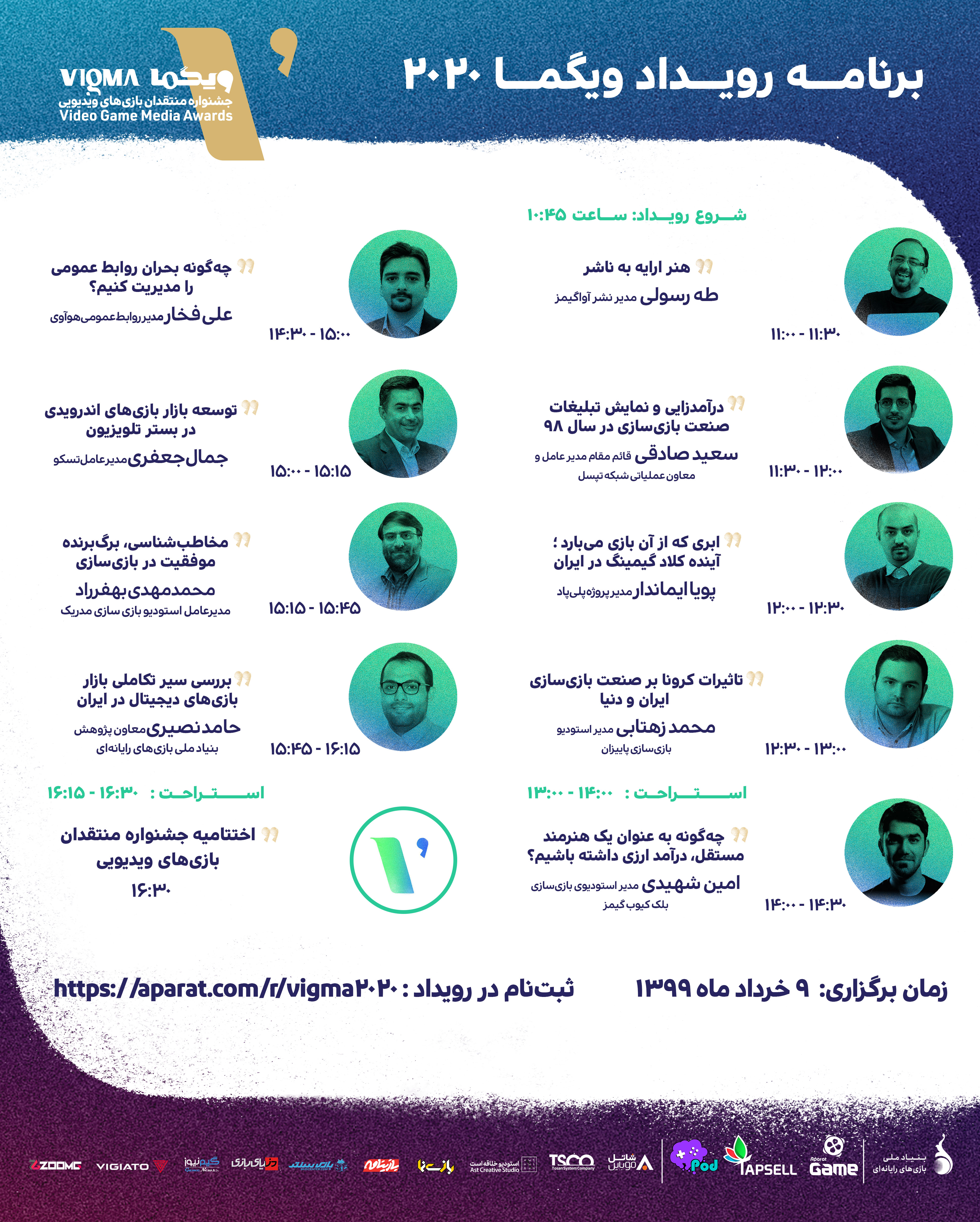 در جریان این رویداد یک روزه، سخنرانان مطرح صنعت بازی‌سازی کشور در موضوعات مهم و تخصصی این حوزه تجربیات خود را به اشتراک می‌گذارند. پس از نهایی شدن تصمیم برگزاری رویداد ویگما به صورت آنلاین، تعداد سخنرانی‌های تخصصی جشنواره منتقدان بازی‌های ویدئویی افزایش یافت. رویداد ویگما که در روز ۹ خرداد ۹۹ در ساعت ۱۰:۴۵ صبح آغاز می‌شود، با پخش زنده اینترنتی از بستر آپارات میزبان علاقه‌مندان و ثبت‌نام‌کنندگان خواهد بود.
